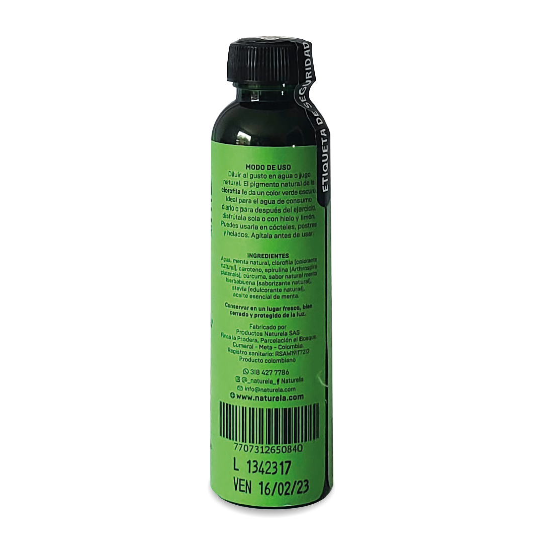 Bedida verde para diluir rica en antioxidantes y vitaminas contiene menta, clorofila, spirulina, curcuma y hierbabuena. Excelente opcion para mantenerse hidratado.